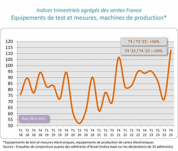 L’indice des composants électroniques a progressé de 5% au 4ème trimestre 2023, mais reste en baisse de 6% sur un an. Cette croissance est due à la correction des stocks, conséquence de la pénurie et des allocations de 2022, qui a impacté les 2ème et 3ème trimestres 2023. Cependant, les prises de commande et la confiance sont en baisse depuis le 4ème trimestre 2023, reflétant des perspectives économiques moins favorables qu’en 2023.