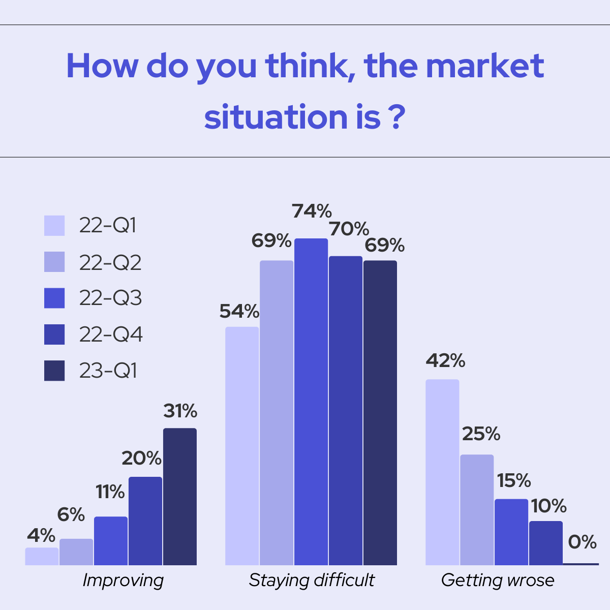 👉 La tendance générale constatée aux 3 trimestres précédents se renforce donc encore en ce début 2023. La perception très majoritaire des acheteurs industriels est : “Le marché reste très difficile avec une amélioration continue”.